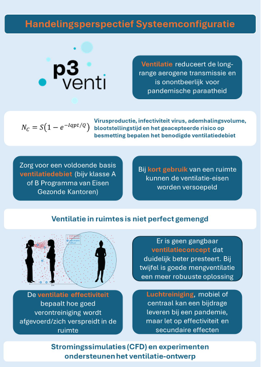 Het handelingsperspectief is niet allesomvattend, maar focust op de facetten die van belang zijn voor de werking van een ventilatiesysteem in het geval van een pandemische situatie. Ontwerpers en adviseurs houden uiteraard de vrijheid om een ventilatiesysteem voor een ruimte zo te ontwerpen dat aan de vele eisen en randvoorwaarden voldaan wordt.